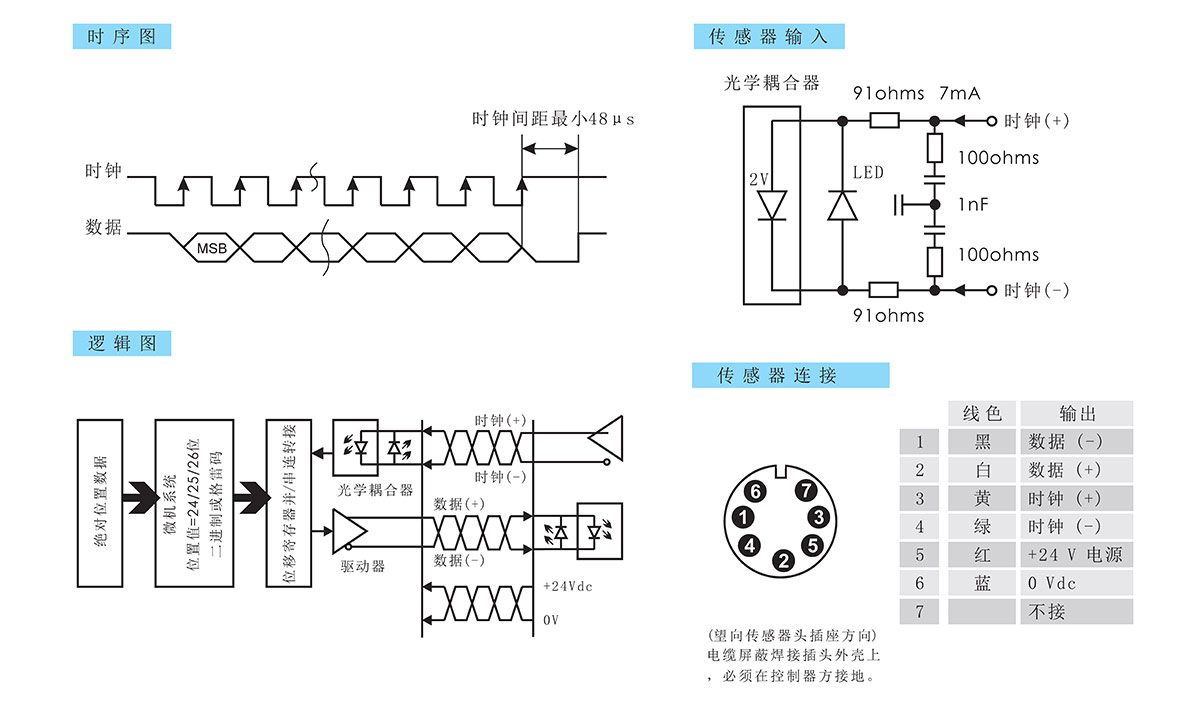 德敏哲16系列(SSI)同步串行输出信号是经济,而能达到较高抗干扰性的数字信号输出。SSI同步串行信号输出Synchronous Serial Interface,由两组RS422差分信号组成,由接收信号端控制器发送开始——中断的时钟脉冲,触发器设备返回另一组数据信号,每一个时钟周期对应一位数据,在接收端控制器中“同步”读取。