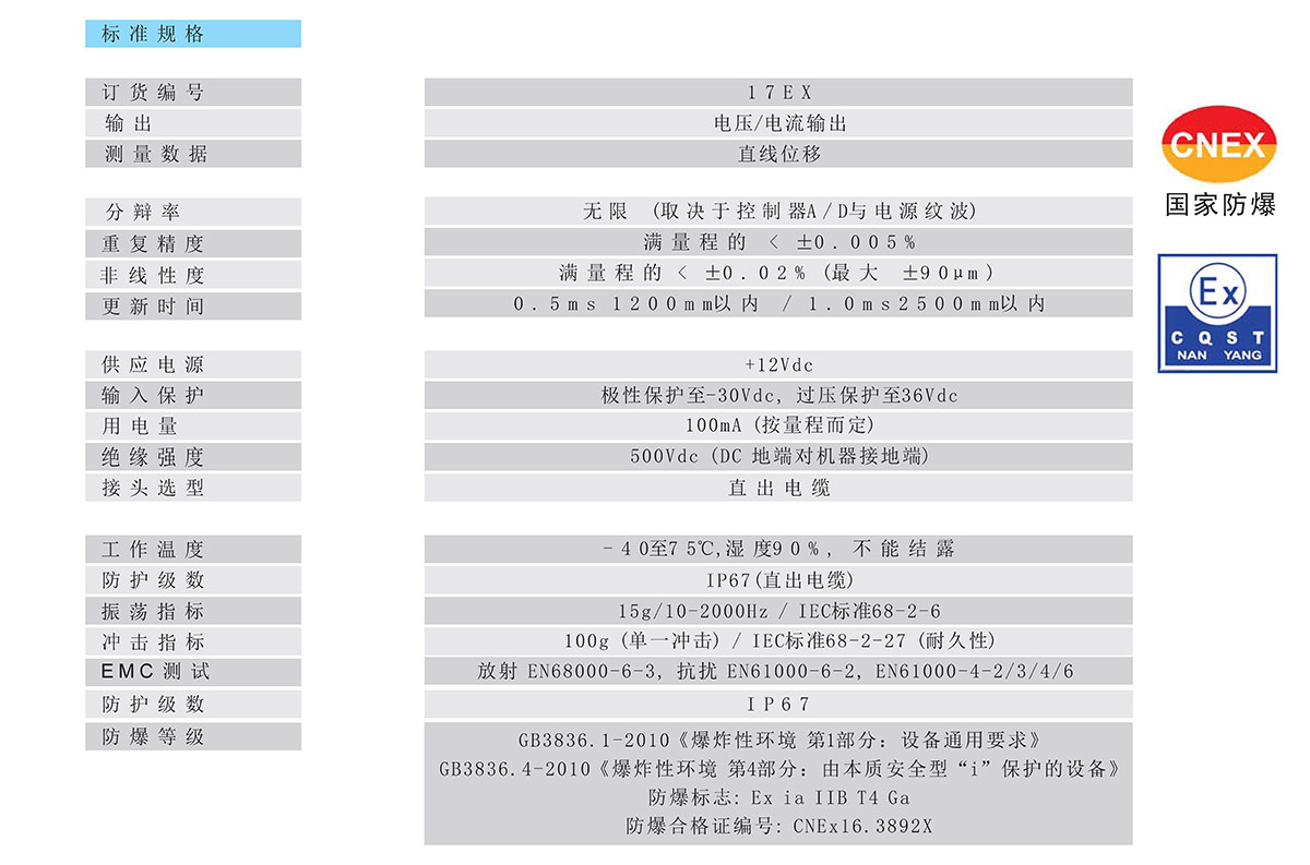 德敏哲17EX系列本安防爆型磁致伸缩位移传感器是严格按照国家防爆电气产品质量监督检验中心GB3836.1-2100《爆炸性环境用 第1部分:设备通用要求》、GB3836.4-2010《爆炸性环境用 第4部分:由本质安全型“i”保护的设备》的要求研制、设计、制造。还获得国家防爆电气产品质量监督检验中心颁发的防爆合格证书。防爆标志:Ex ia IIB T4 Ga。