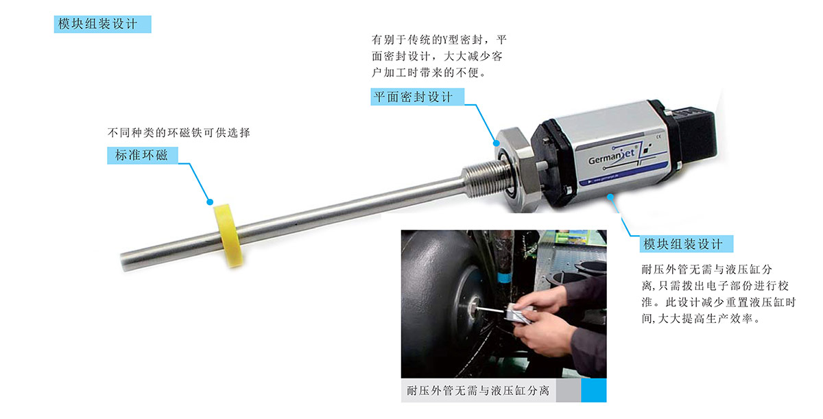 Germanjet 17系列磁致伸缩位移传感器是采用非接触式磁致伸缩测量技术,此技术能提供精准、直接值的位移输出。17系列是专为液压缸而设计,耐压外管与六角法兰为不锈钢制造,可以直接安装进液压缸里。电子部分与耐压外管为模块化组装设计,即两者可完全分离。在特殊情况下,只需拔出电子部分进行校准,而耐压外管无需与液压缸分离。此设计减少重置液压缸时,大大提高生产效率。