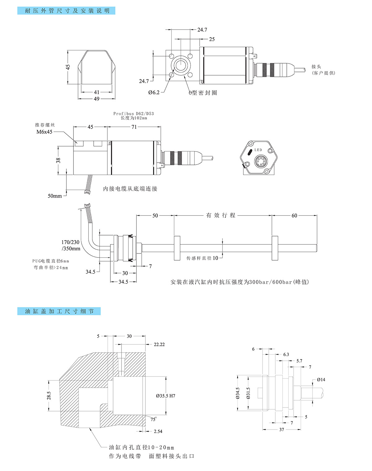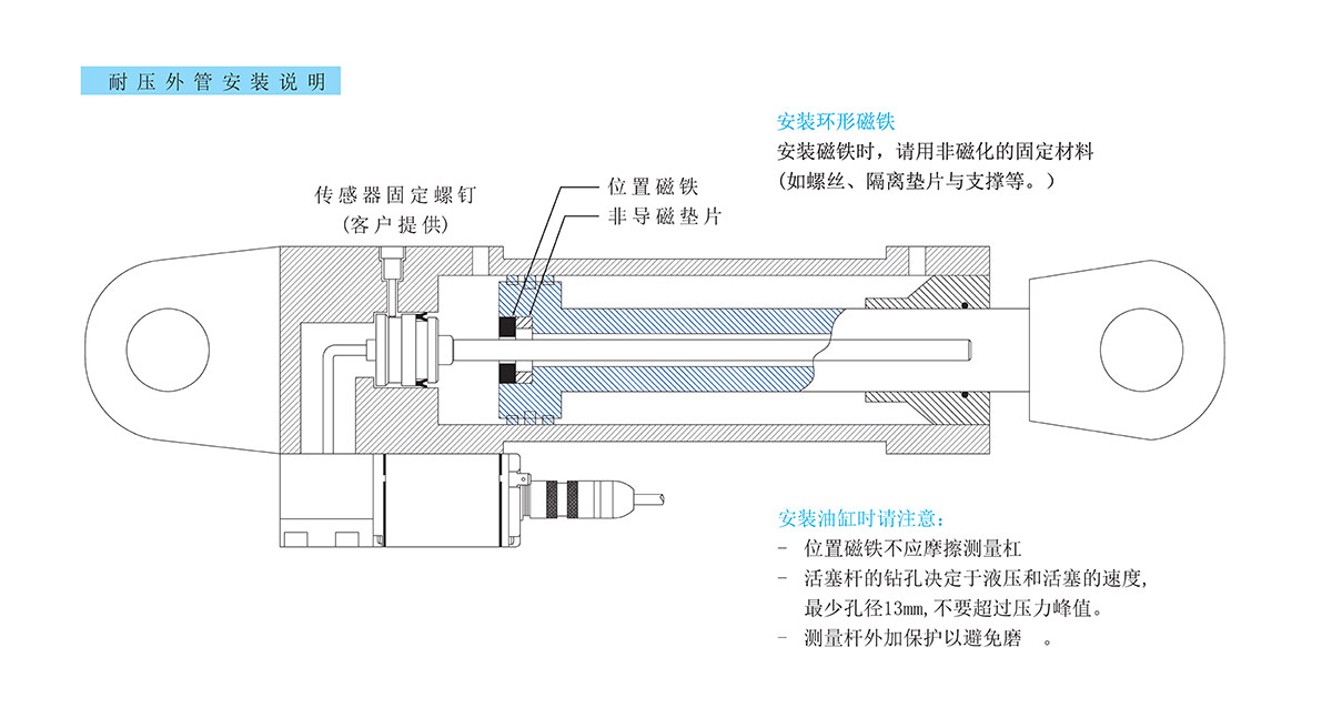 D型特别适用于受空间限制的油缸或两端都带U形吊环的油缸内安装 。传感杆为感应元件,它包括一条带紧压密封安装的耐压不锈钢管。整支传感杆通过活塞孔装入活塞内。外部连接的电子仓部分和传感杆的连接可通过接合板底面的电缆进线。