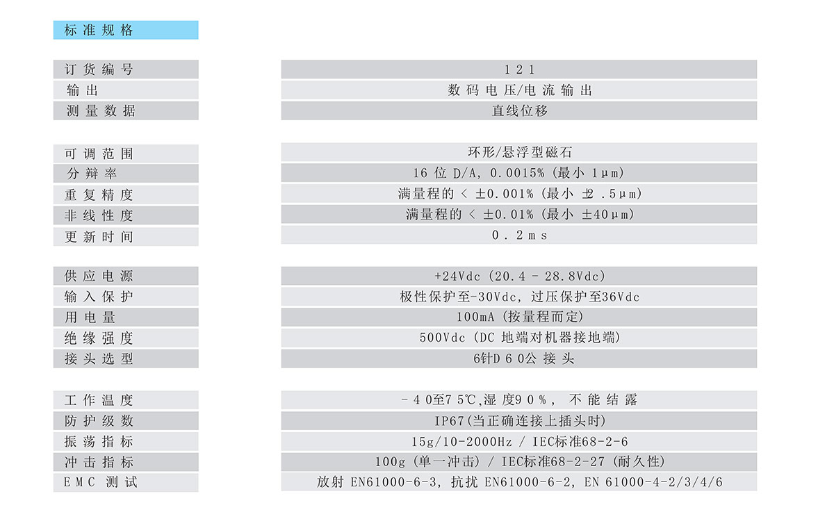 121系列是采用非接触式磁悬浮测量技术。此技术能提供精准、直接值的位移输出。而且能消除所有工作磨损而带来的误差。电子部分为IP65等,使电子模块受到较好的抗震,防尘和防潮保护。输出连接为业界常用的航空接头(D60),既方便又容易接线。